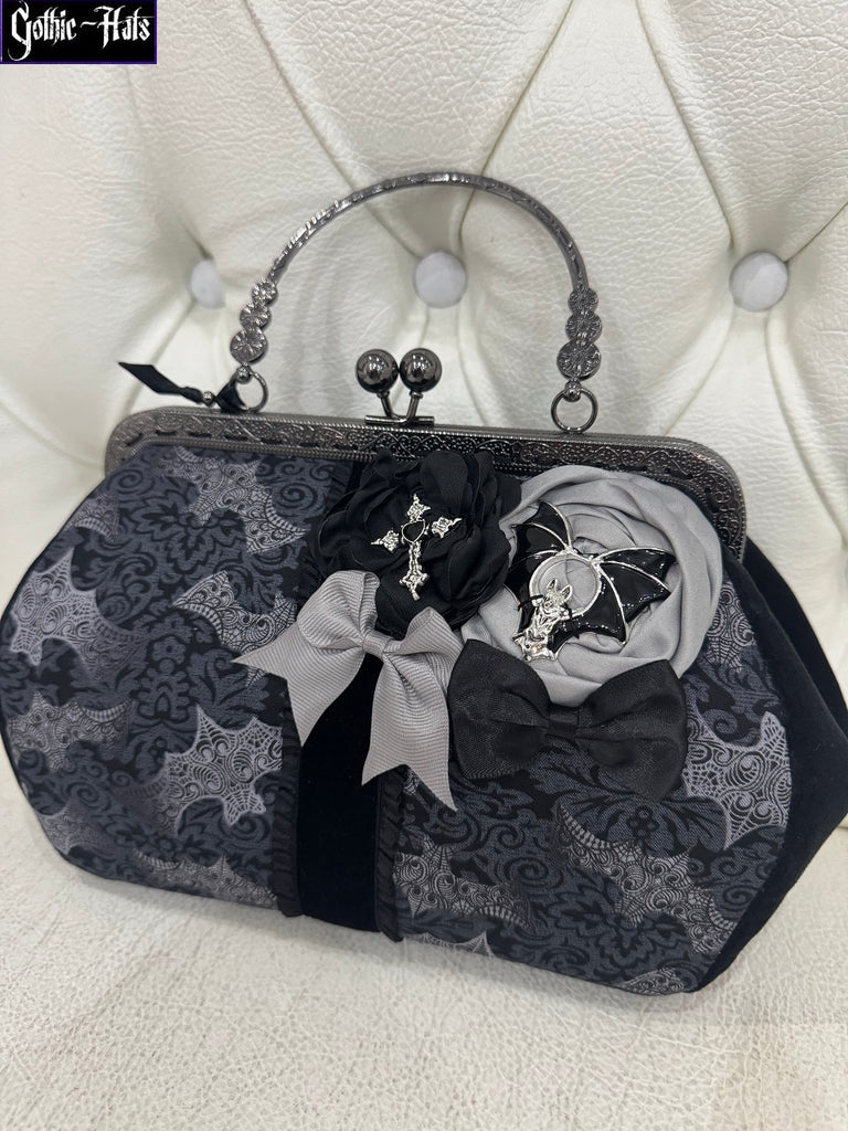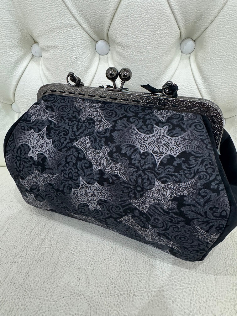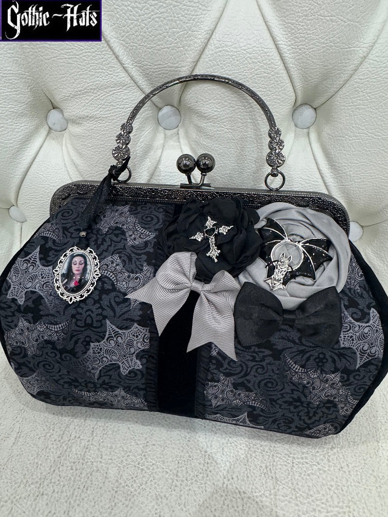 Handmade Calista Bag with 20cm frame, bat fabric, black velvet sides and charms. Approx 25 x 17 x 11cm. Black blood fabric lining.