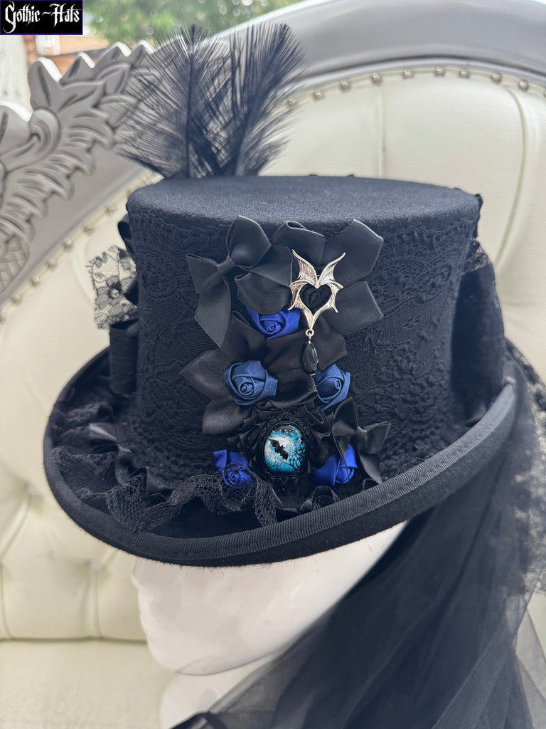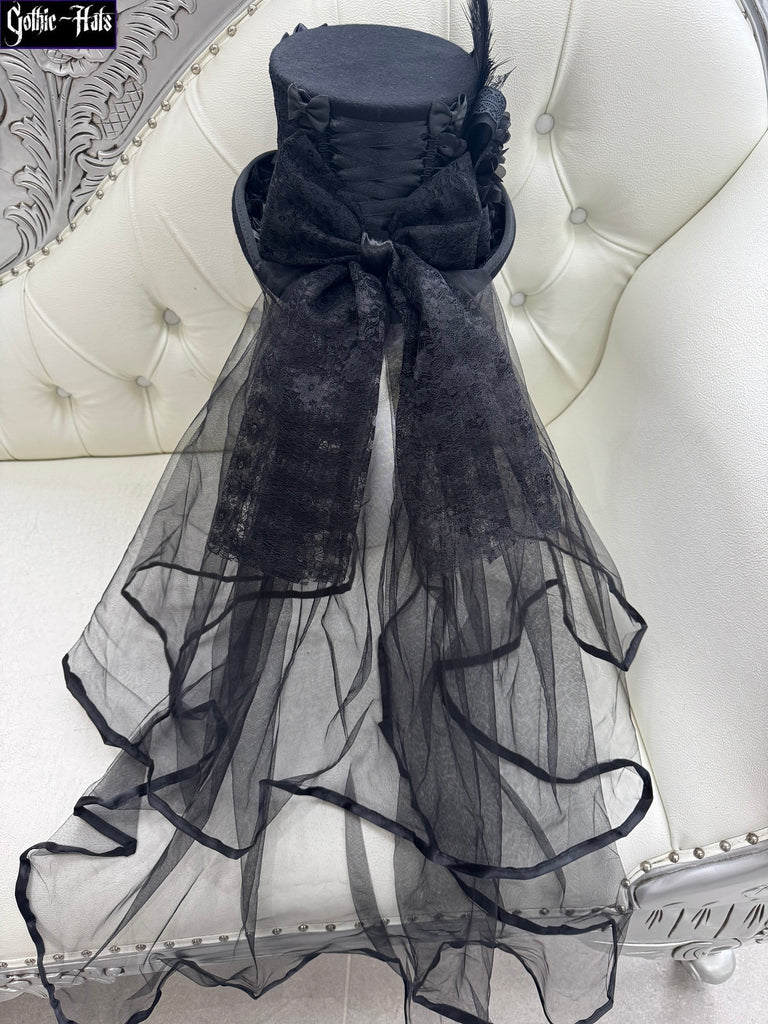 This black top hat features a black lace lace overlay, black rose, silver charms, with a long black veil, black satin ribbon corset and bow at the back. Size 54cm, 1 available.