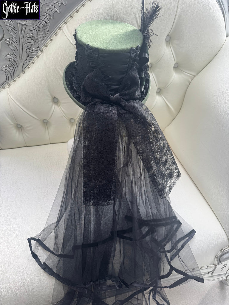 This green top hat features a black lace lace overlay, black rose and black velvet bow, charms, with a long black veil, black satin ribbon corset and bow at the back.  Size 56cm, 1 available.