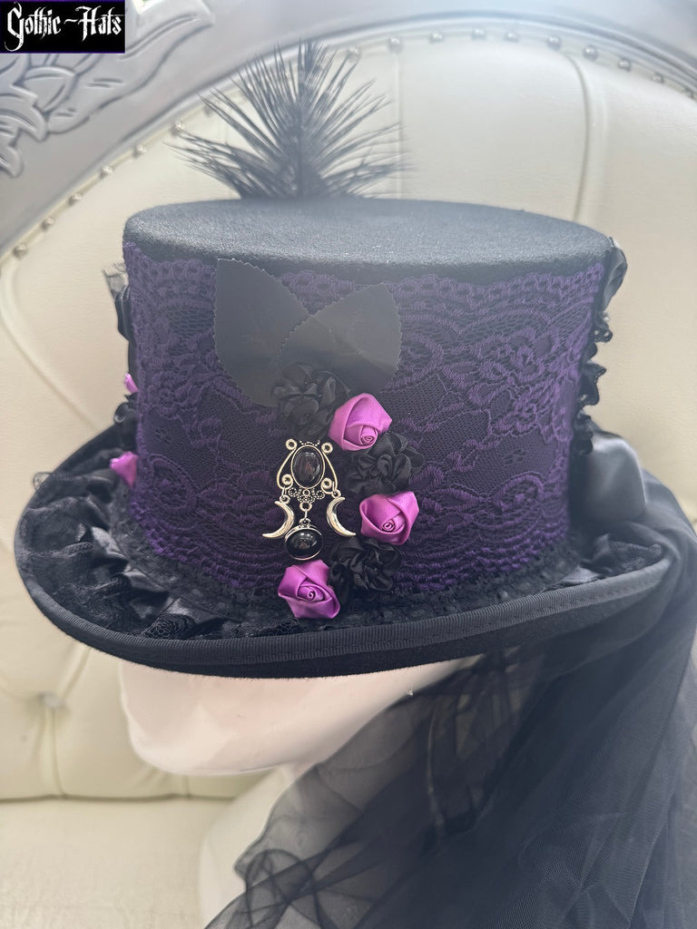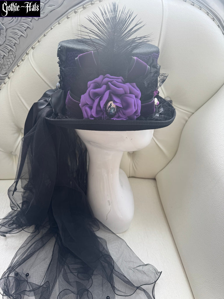 This black top hat features a purple lace lace overlay, black rose and black velvet bow, silver charms, with a long black veil, black satin ribbon corset and bow at the back.  Size 55cm, 1 available.