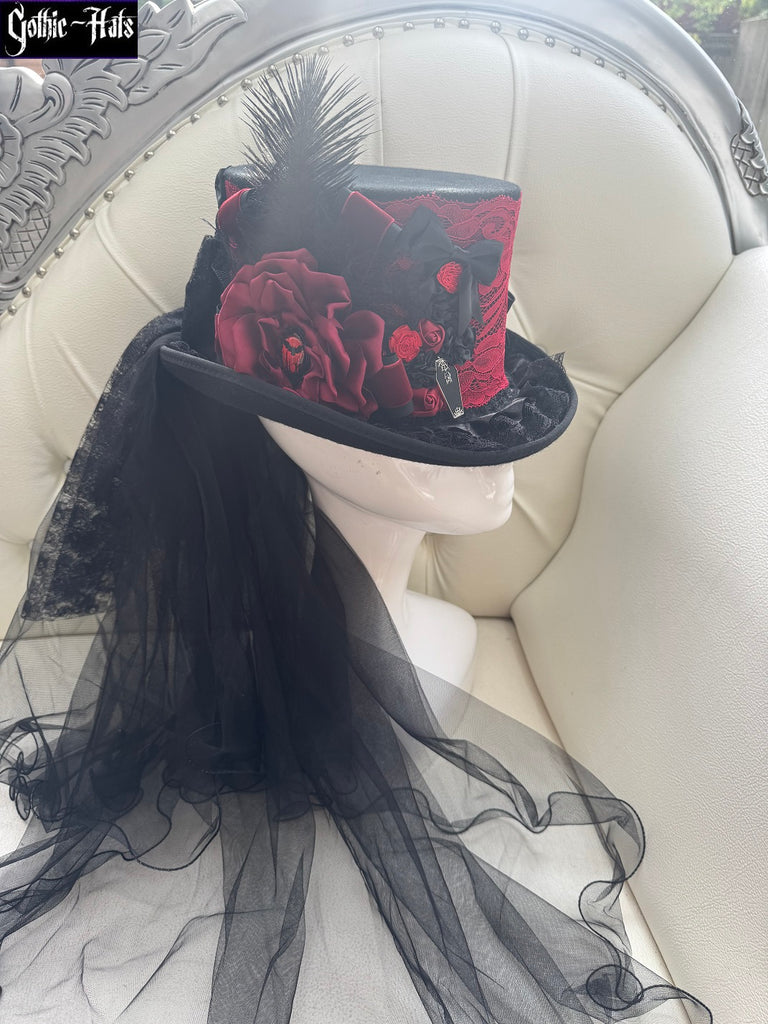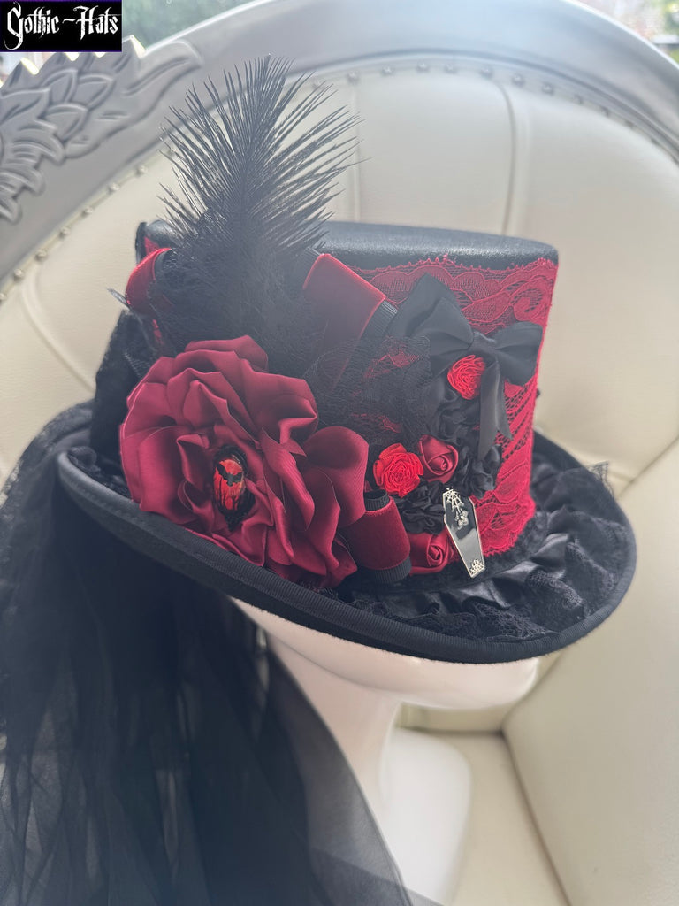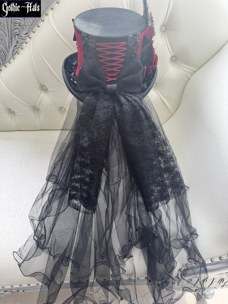 This black top hat features a red lace lace overlay, black rose and black velvet bow, silver charms, with a long black veil, black satin ribbon corset and bow at the back. Size 55cm, 1 available.
