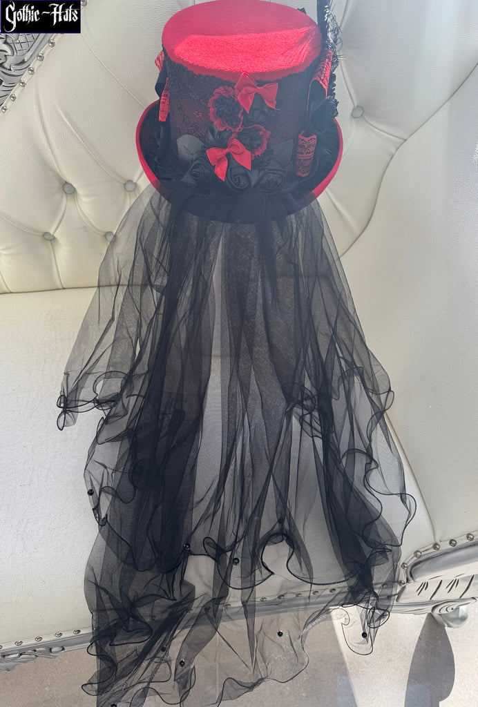 This red top hat features a black lace overlay, black rose and black bow, charms, with a long black veil, size 56cm, 1 available.