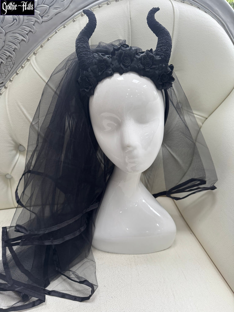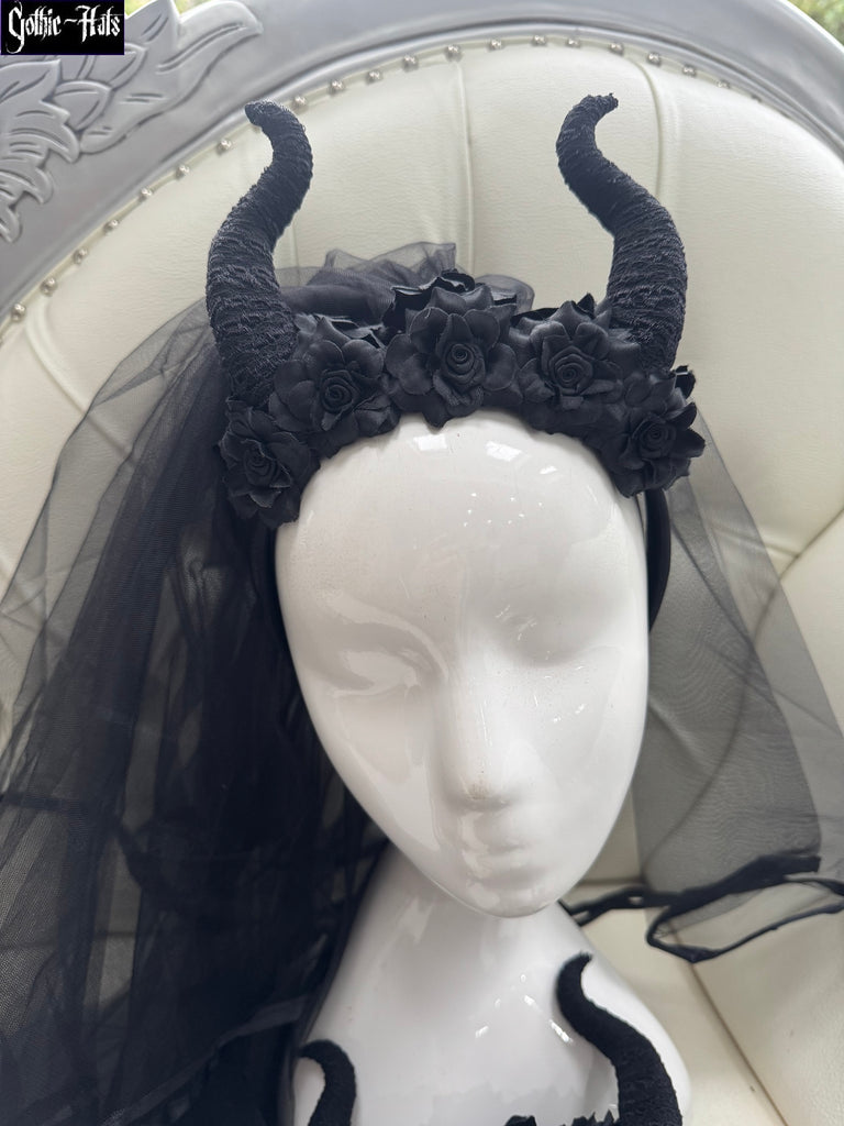 Satin and lace horns with flowers headdress on a wide black satin headband with a long veil