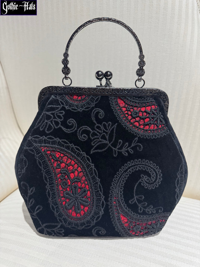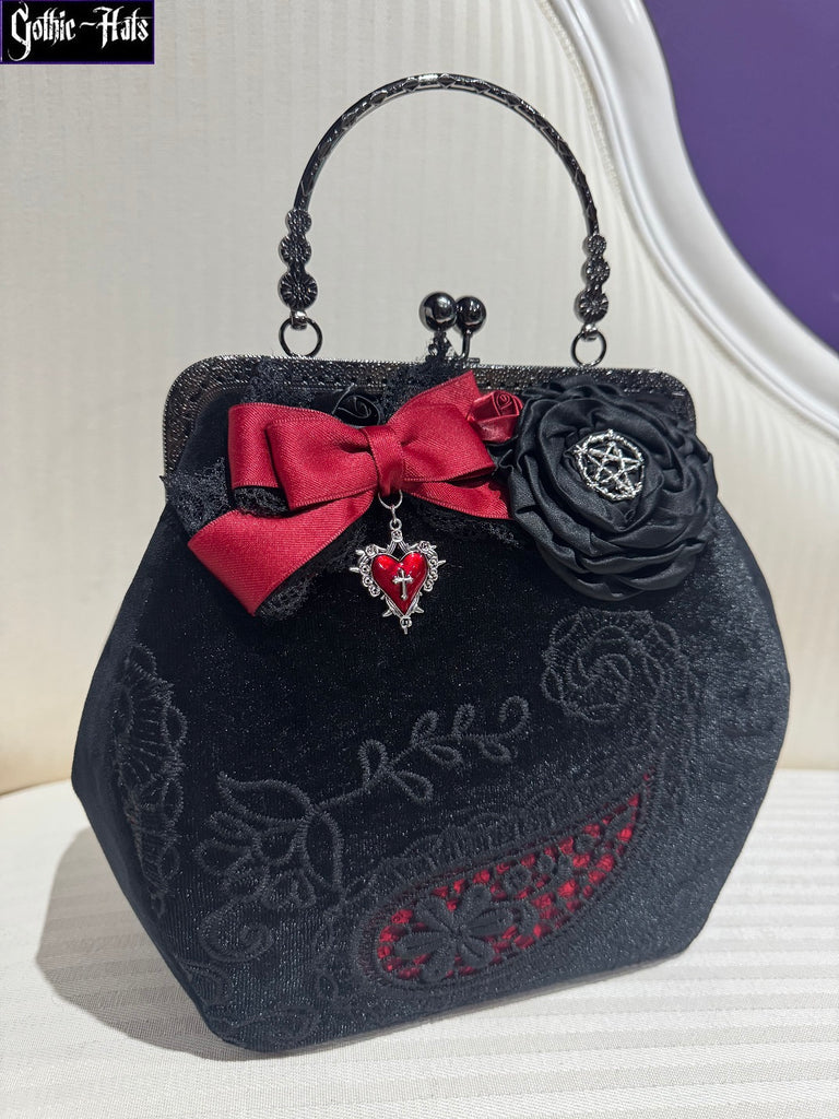 Handmade Velvet 18cm Gun Metal Framed Bag, with black velvet sides and charms. Approx 20 x 23 x 11cm. Black Lining. Handstitched into frame. Unique, only one made.