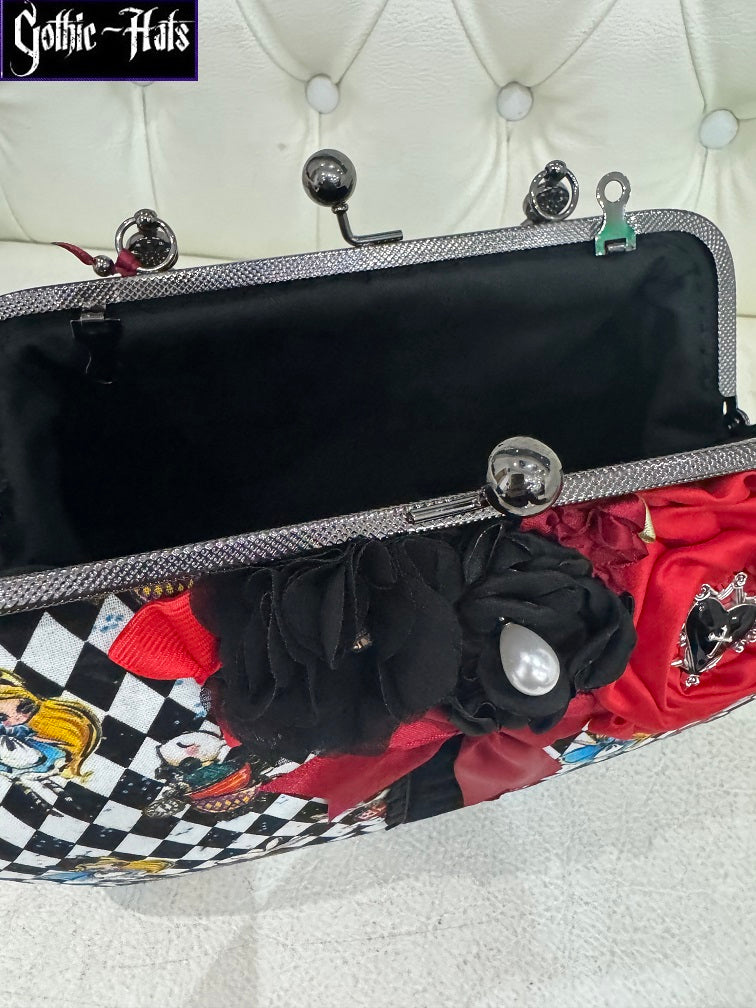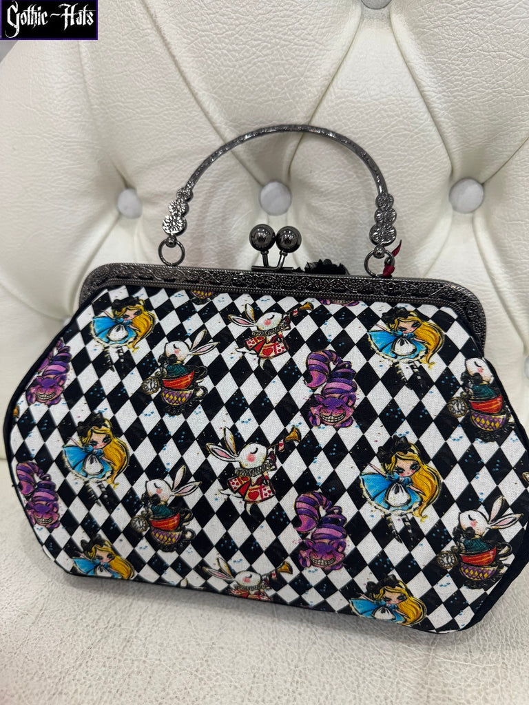 Handmade Calista Bag with 20cm frame, Wonderland fabric, black velvet sides and charms. Approx 25 x 17 x 11cm. Black fabric lining.